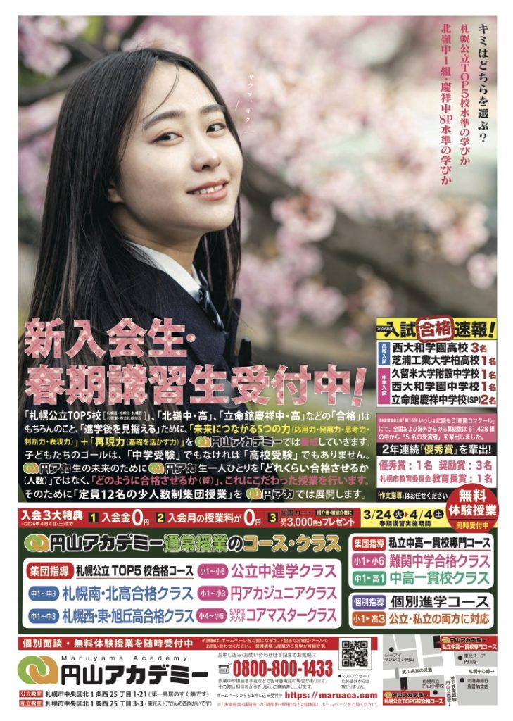 こんにちは!円アカです! 円アカの中学受験対策は、「サピックスメソッド」、「5教科指導」、「少人数制集団授業」です。それはなぜか。 札幌北高校のホームページに「特に英語と数学に関しては、中学・高校間の… 続きを読む: 円アカの難関中学合格クラスとは - 首都圏の高校入試結果速報こんにちは!円アカです! 首都圏の高校入試の結果で判明した分をご報告したいと思います。 合格基準偏差値 都立国際:51 札幌南:44 札幌北:43 札幌西:42 札幌東:40 合格基準偏差値 芝浦:4… 続きを読む: 首都圏の高校入試結果速報