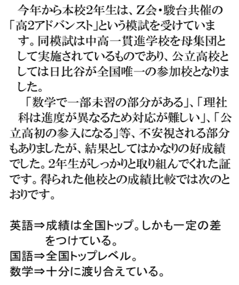 都立日比谷高校で、中高一貫校専用のアドバンスト(Z会)に参加して、全国でも有数の結果を出した内容を日比谷高校のホームページで読んだことがあります(下記が一部抜粋です)。確かに日比谷は公立高校でも全国でも屈指の進学校ですが、アドバンストに参加している中高一貫校も全国で屈指の進学校ですし、一般的に一貫校では、数学・英語は、高校受験をする中学生よりも先取りの勉強をしているので、日比谷の生徒より本来なら有利のはずです。
