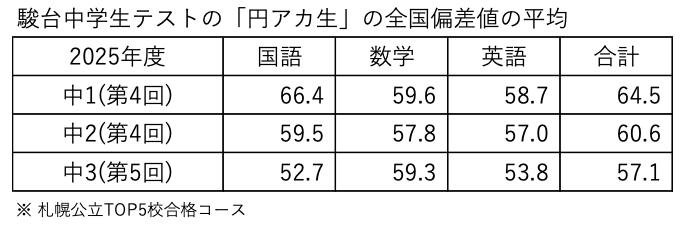札幌北高校のホームページに「学力の状態や学習習慣をチェックする調査では、英語と数学の学力がその後の学習や進路に大きく影響するという結果が出されており、進路目標の実現のためには、英語と数学における高い学力が不可欠となります。」とあります。これは一例ですが、進学校と言われる学校の先生ならば、公立・私立関係なく同じことを言うのではないかと思います。そのために円アカでは、首都圏の難関高校の模擬試験である「駿台中学生テスト」を活用しています。